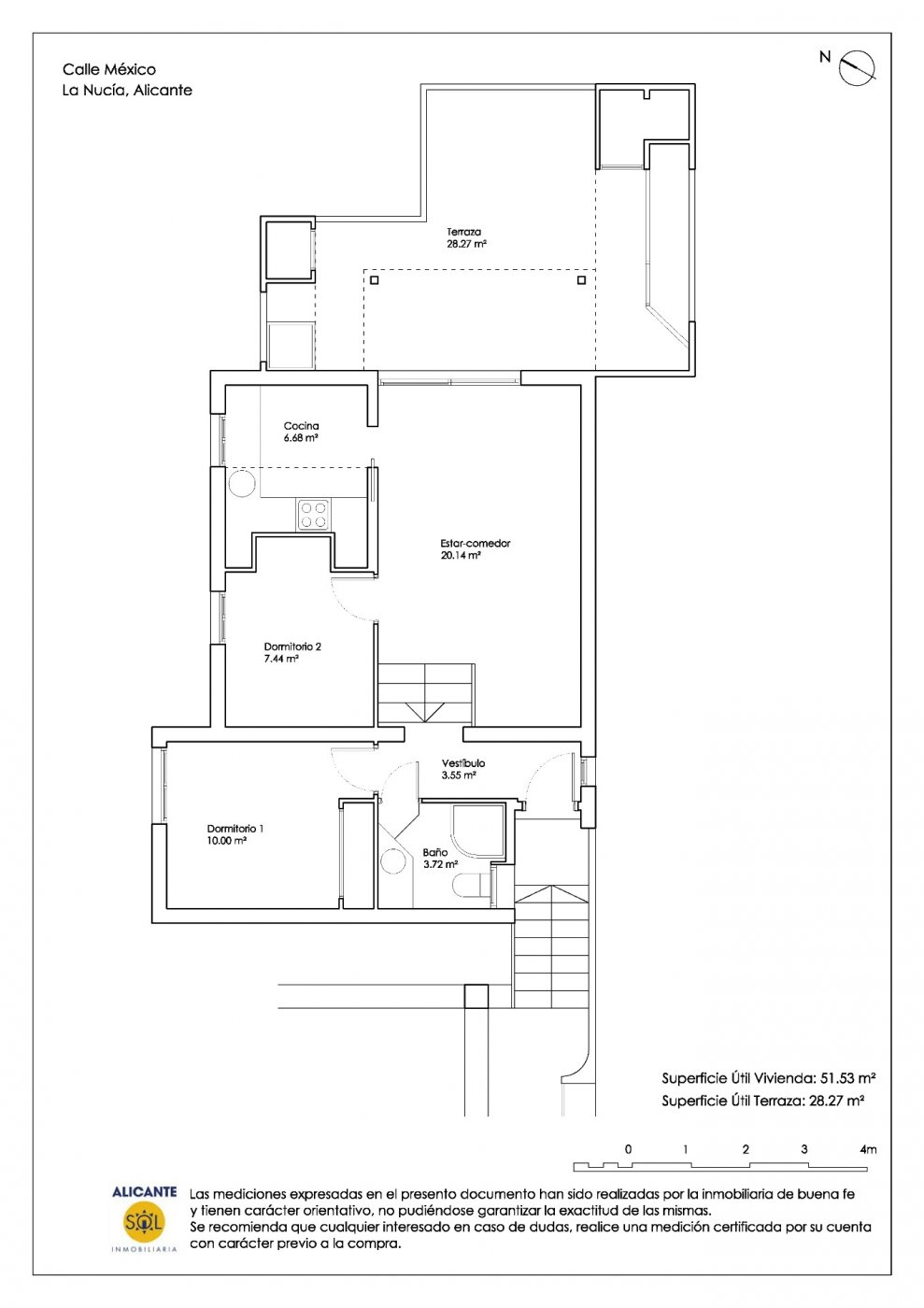 Este bonito apartamento está localizado en una tranquila urbanización a 6 kms. del centro urbano de la Nucía y a 6,5 kms. de Benidorm. Desde su amplísima terraza de 28 m2 se puede divisar la Isla de Benidorm y disfrutar de muchas horas de sol y luminosidad interior gracias a su esquina orientación SUR y ESTE.. Superficie construida catastral: 60 m2.. Superficie construida comprobada por técnico: 62 m2.. Superficie útil comprobada por técnico: 52 m2.. Superficie terraza descubierta (registral y comprobada por técnico): 28 m2.. . El apartamento se sitúa en la primera planta de este pequeño complejo de pocas viviendas con zonas comunes ajardinadas, tiene cochera cerrada privada y reducidos gastos de comunidad. Recientemente ha recibido una reforma parcial con paredes en liso y pavimentos de gres.. . * Gastos de Notaría, Registro de la Propiedad e impuestos (ITPAJD, IVA) no incluidos en el precio.