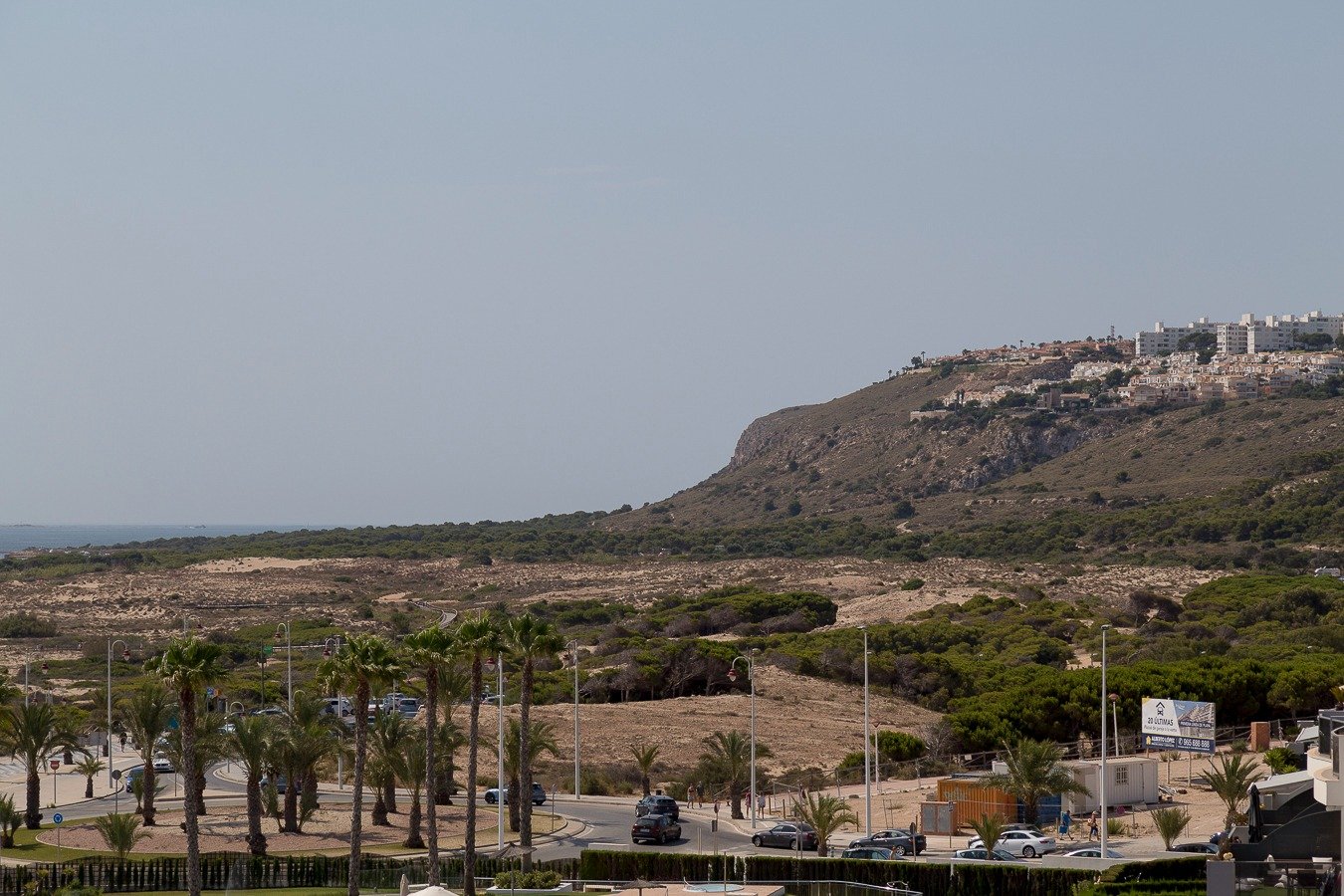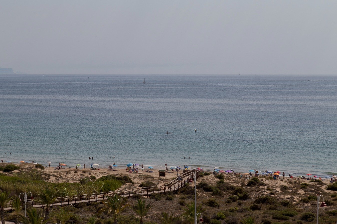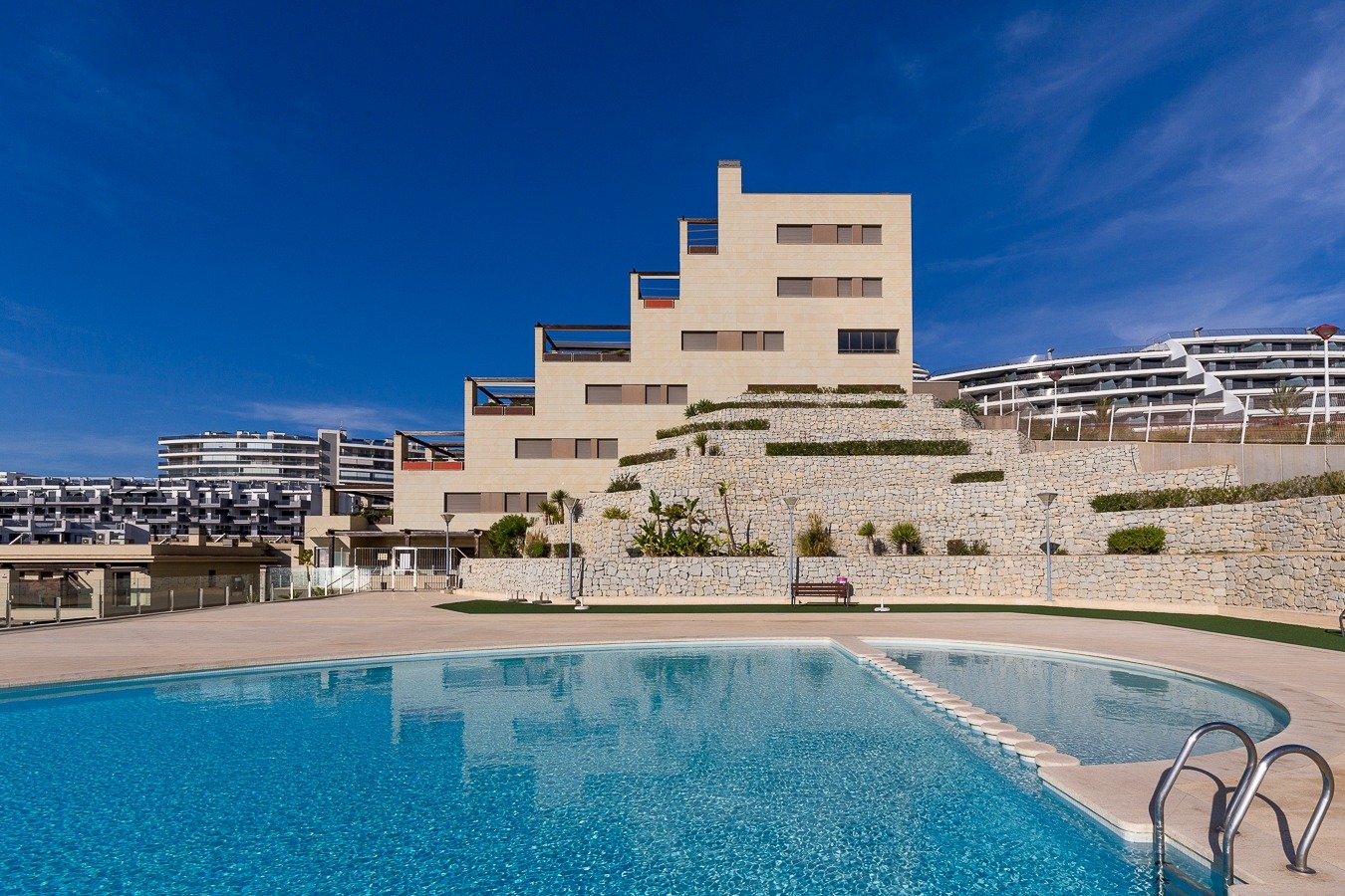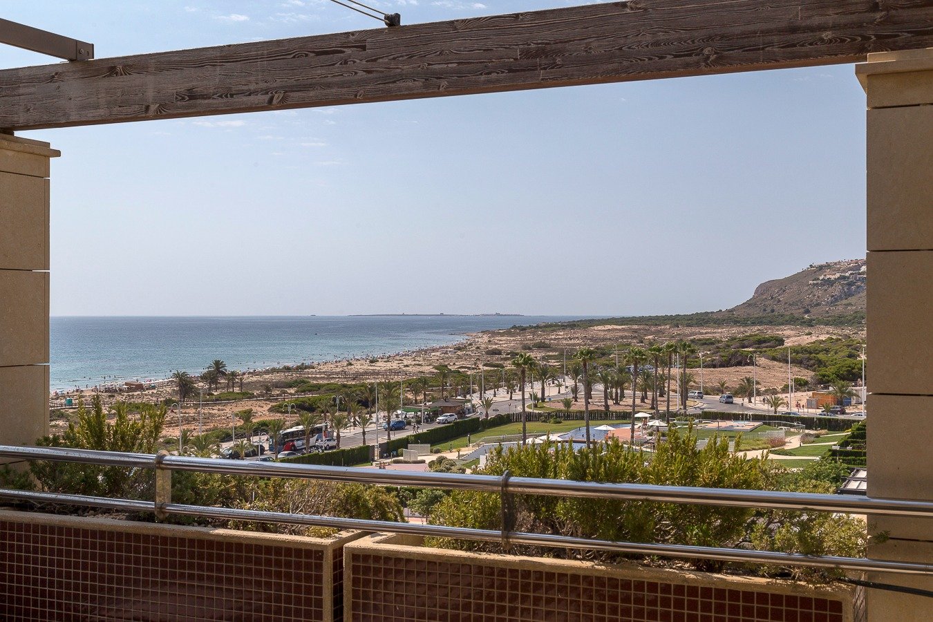 Apartamento esquina (frontal este y lateral sur) con vistas panorámicas de 270º. Desde su terraza de 33 m2. se pueden divisar desde Cabo de las Huertas, y Alicante ciudad, pasando por toda la playa de Arenales del Sol, Isla de Tabarca y hasta el Cabo de Santa Pola. . . Su orientación lo hace excelente para disfrutarlo en cualquier época del año, requiriendo muy poco uso de energía para su climatización: En verano las brisas predominantes discurren por el interior de la vivienda a través de sus múltiples ventanales y en invierno su posición al sur recibe gran cantidad de sol en casi todas sus piezas.. . Calidades reseñables:. . – Fachadas autoventiladas realizadas en piedra «Bateig», un material aislante y totalmente natural que se extrae de canteras situadas en la comarca.. – Pavimentos de gres porcelánico.. – Ventanales de acceso de terraza con sistema oscilobatiente-deslizable.. – Sistema de aspiración centralizada.. – AACC con conductos por toda la vivienda.. – Puerta principal acorazada.. – Paredes en acabado liso.. – Terraza con toldos correderos de sistema de palillería, tejido realizado en material «Screen». . Incluye 2 plazas de garaje subterráneas de generosas dimensiones + 1 trastero de 5 m2 (privativos).. . Balcón de Arenales Privilege es una de las escasas urbanizaciones en primera línea de la zona que cuentan con acceso al paseo marítimo sin barreras arquitectónicas ni escaleras. Tiene amplias zonas de esparcimiento, piscina desbordante con vistas panorámicas, jardines y accesos a la urbanización desde varios puntos.. . Otros datos de interés:. – Superficie catastral: 116 m2.. – Superficie útil vivienda: 70,50 m2.. – Superficie útil terraza: 33 m2.. – Total superficie útil (vivienda + terraza): 103,50 m2.. – 4 fincas registrales y catastrales (vivienda + 2 plazas de garaje + trastero). . * Gastos de Notaría, Registro de la Propiedad e impuestos (ITPAJD, IVA) no incluidos en el precio..