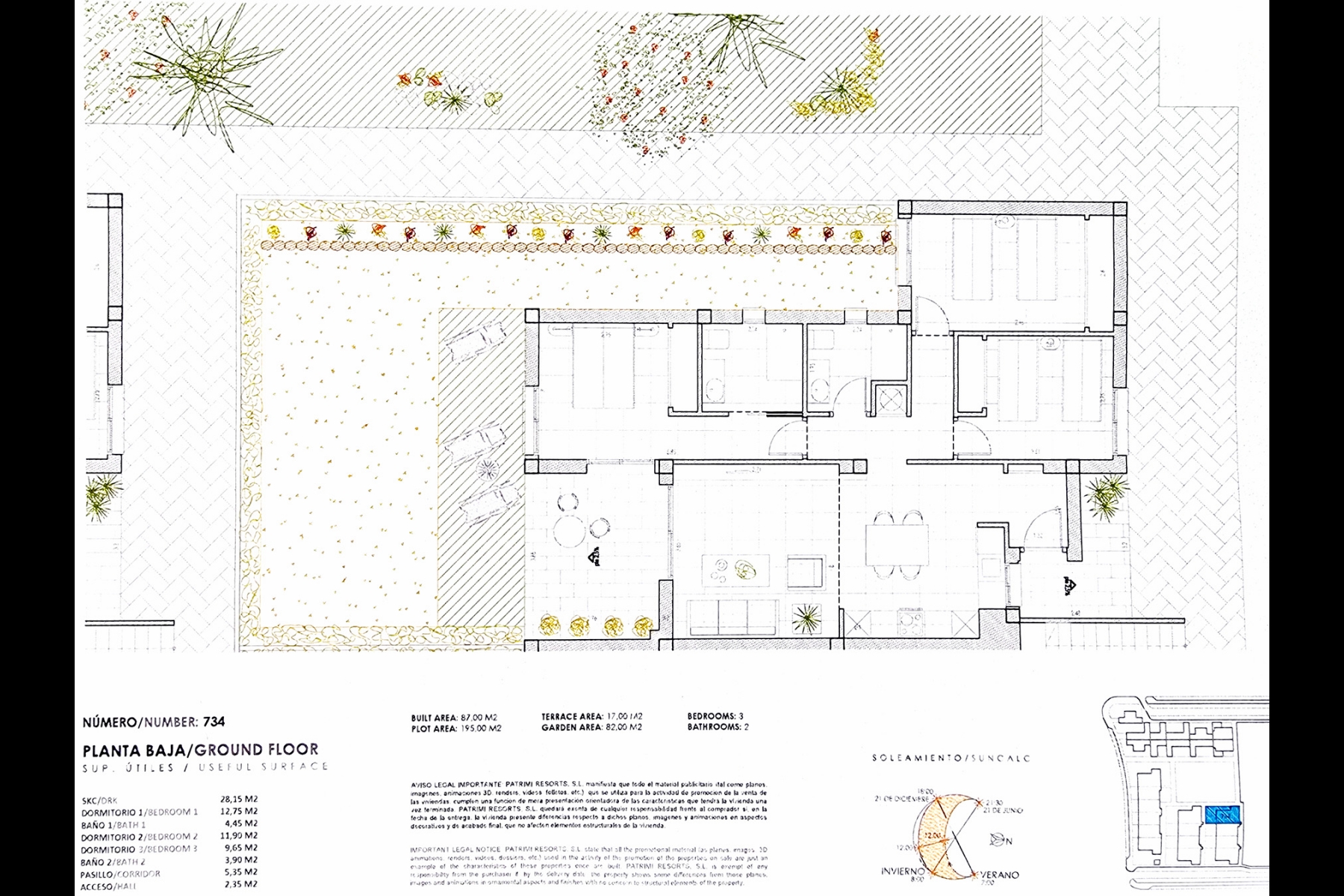 Los gastos de comunidad son aproximadamente 600 euros al año. El tamaño total de construcción del apartamento es de 87 m2 con una terraza de 17 m2 y el jardín mide unos muy generosos 82 m2. El tamaño total de la parcela es de 195 m2.