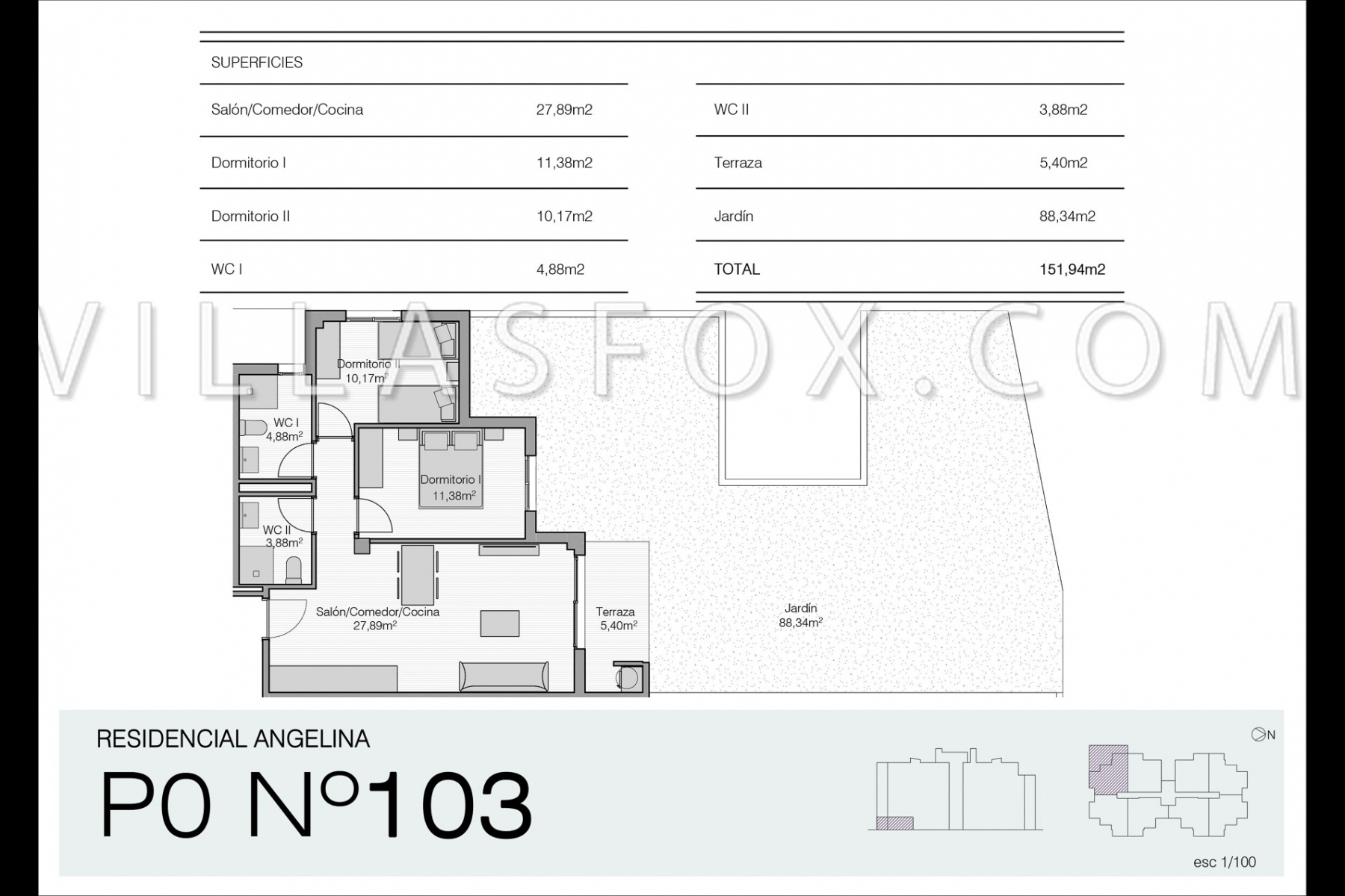 El número 103 es un apartamento de esquina ubicado en la planta baja con 2 dormitorios, 2 baños, una plaza de aparcamiento y se beneficia de un jardín / patio de 88.34 m2 que da a la piscina. El tamaño total interior y exterior es de 154 m2.