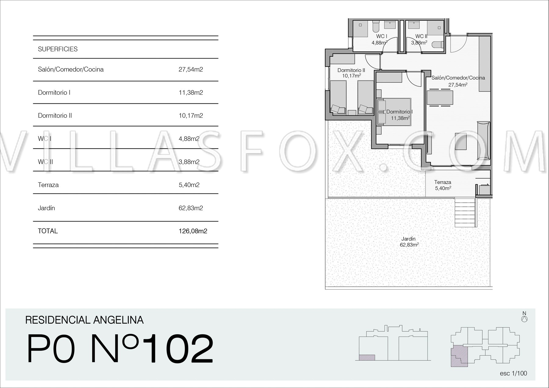 (Villas Fox Ref: 28777) Constructed floor size = 66.00 m2 Plot size = 89.00 m2 Year of construction = 2022 Number 102 is a corner apartment located on the ground floor with 2 bedrooms, 2 bathrooms, a parking space and benefits from a south-facing garden/patio area of 62.83 m2. The total interior and exterior size is 128 m2. It is currently the show house, and is not currently available for sale.
