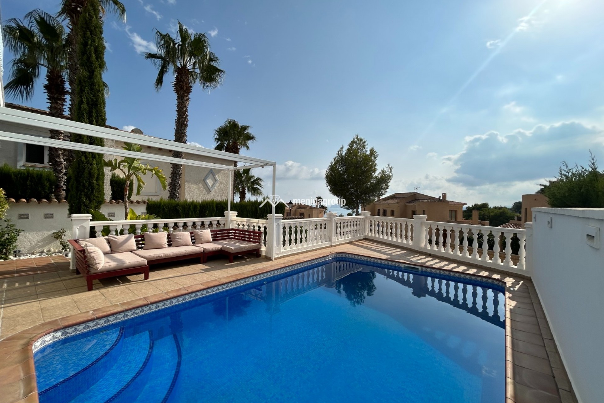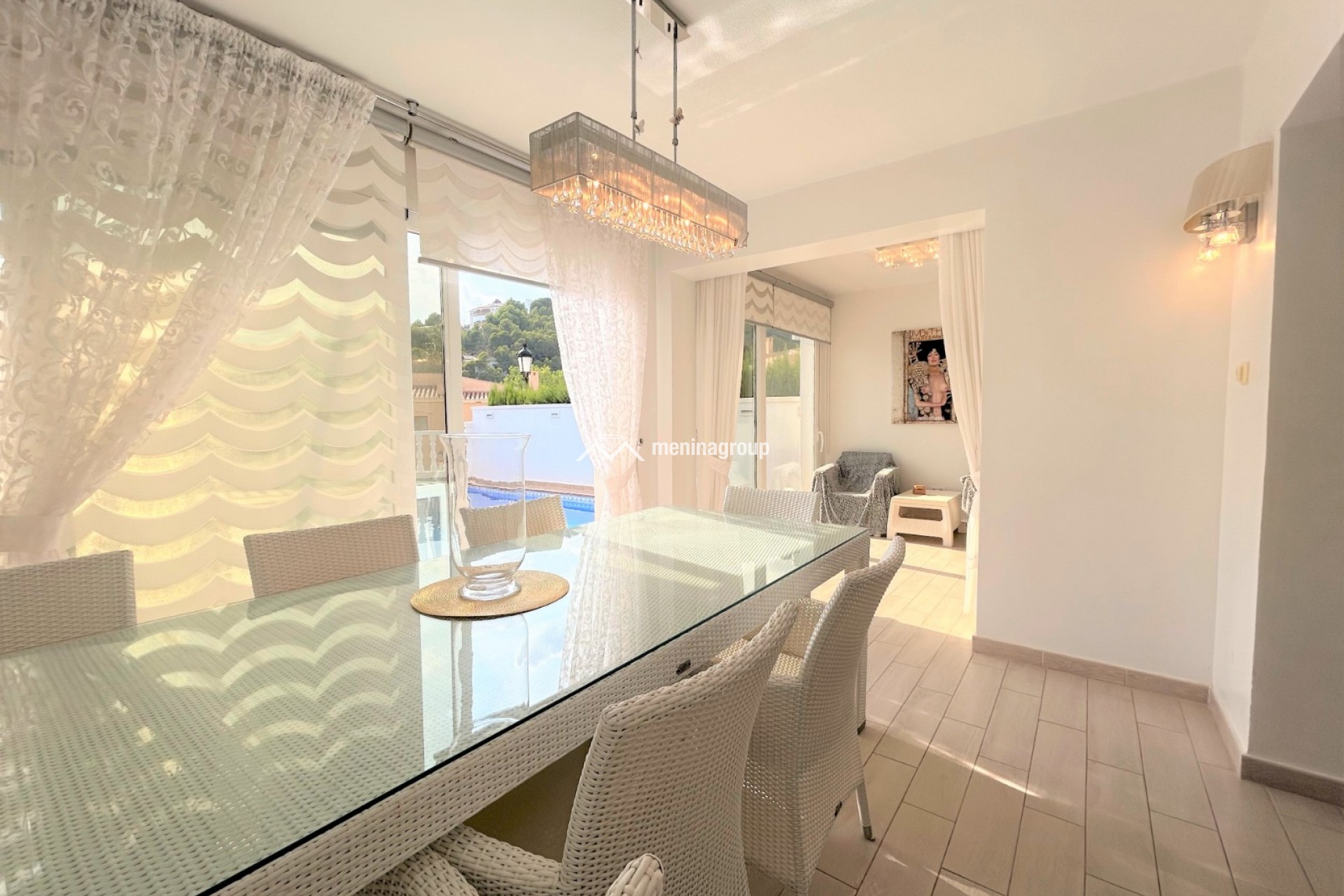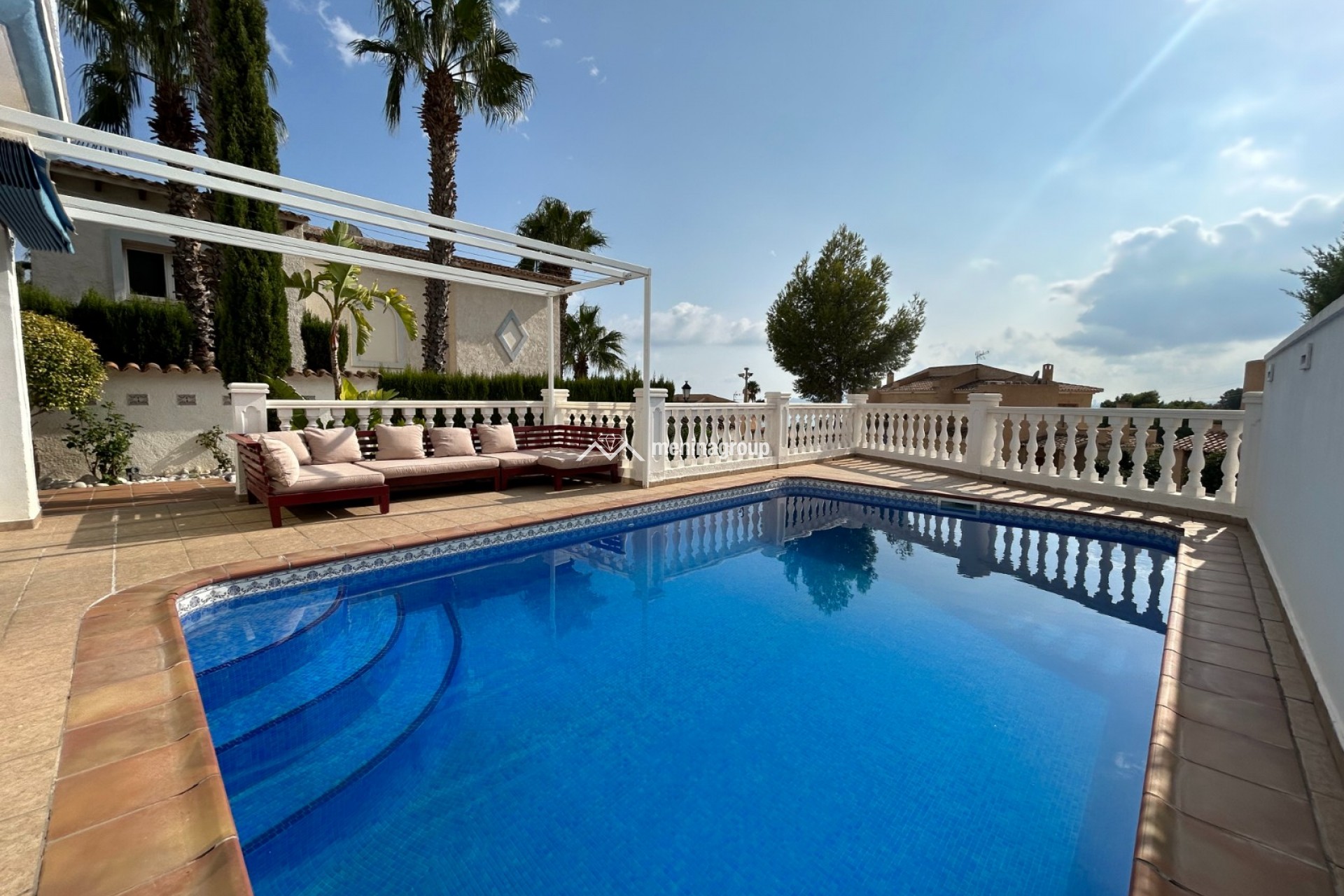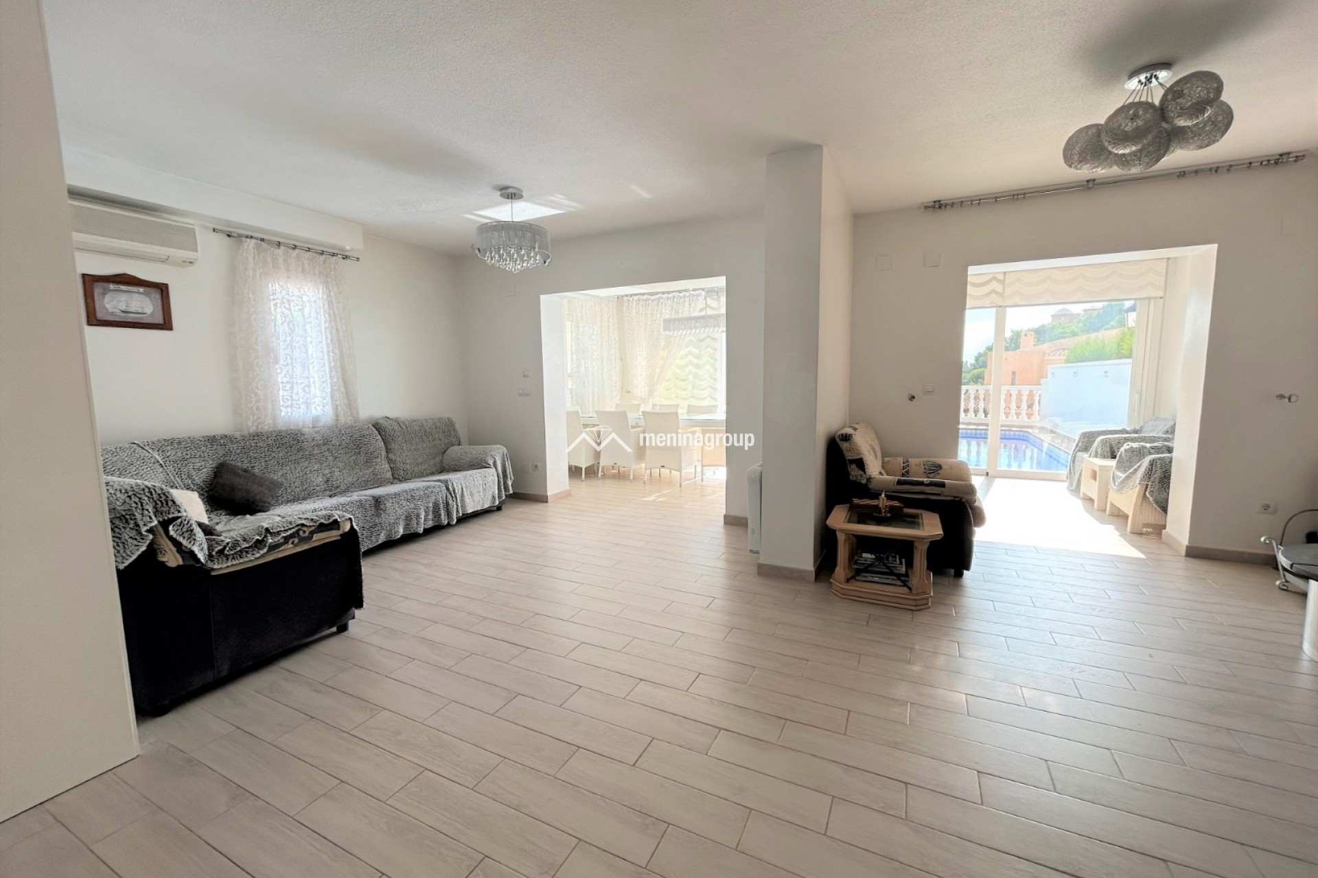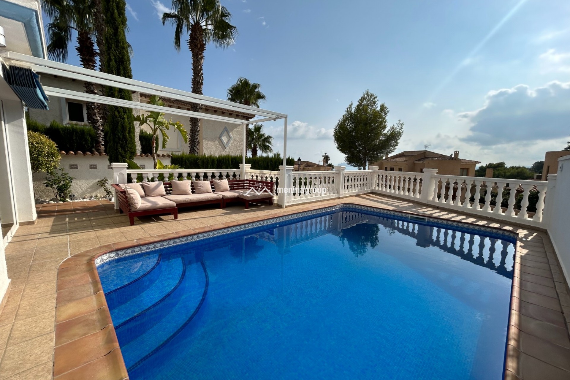 Esta bonita casa con piscina se encuentra situada en la Urbanización de Altea Hills y se distribuye en dos plantas. En la planta baja encontramos un amplio salón-comedor con salida directa a la piscina, la cocina totalmente equipada y con despensa, una habitación y un baño completo con ducha. En la planta superior, tres habitaciones más, una de ellas con baño en suite y un cuarto de baño completo con ducha. En la parte trasera de la casa hay una zona ajardinada de fácil mantenimiento. A destacar: el suelo radiante en la planta baja, radiadores eléctricos en toda la casa, aire acondicionado, chimenea en el salón, climatización para la piscina, trastero y parking privado.