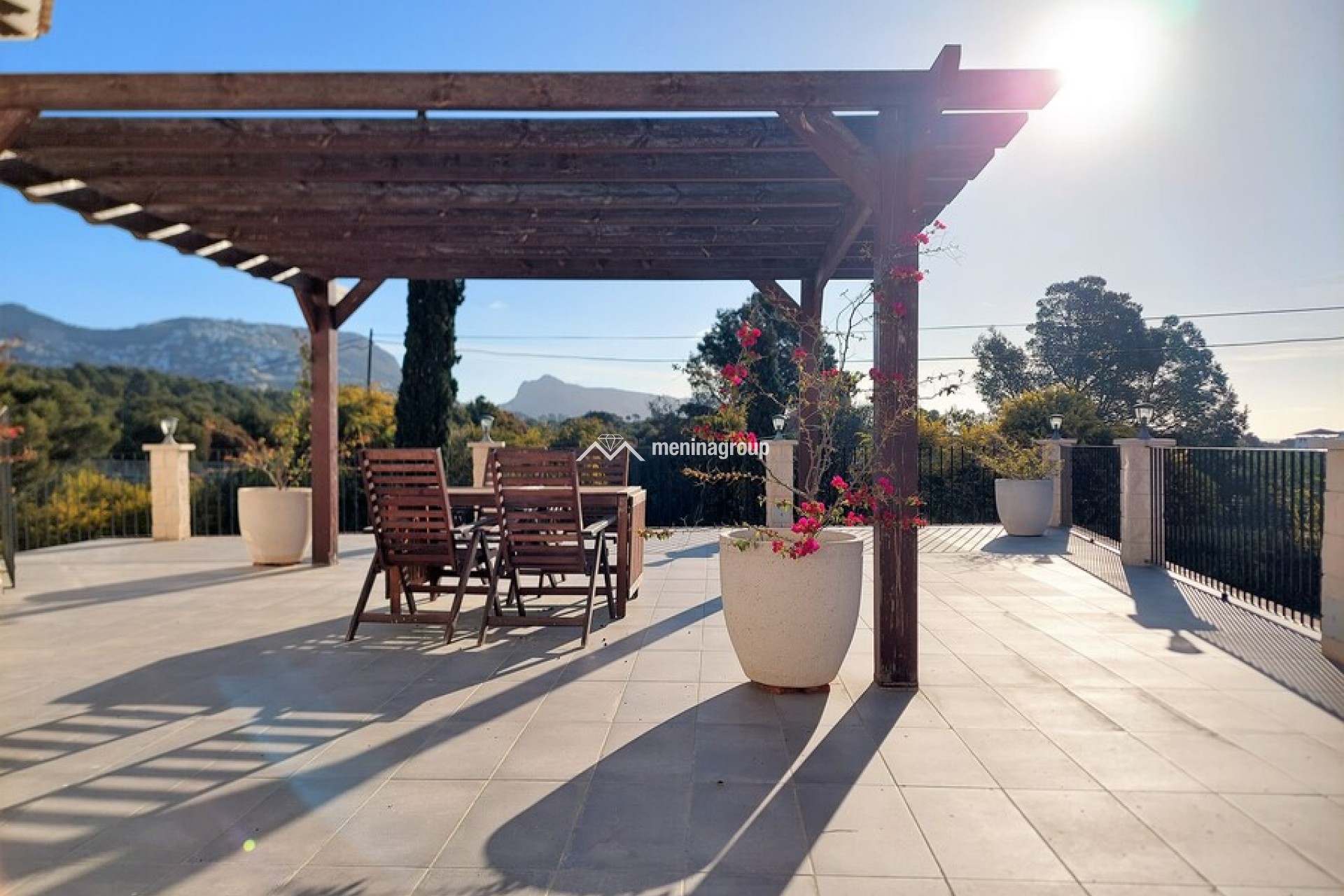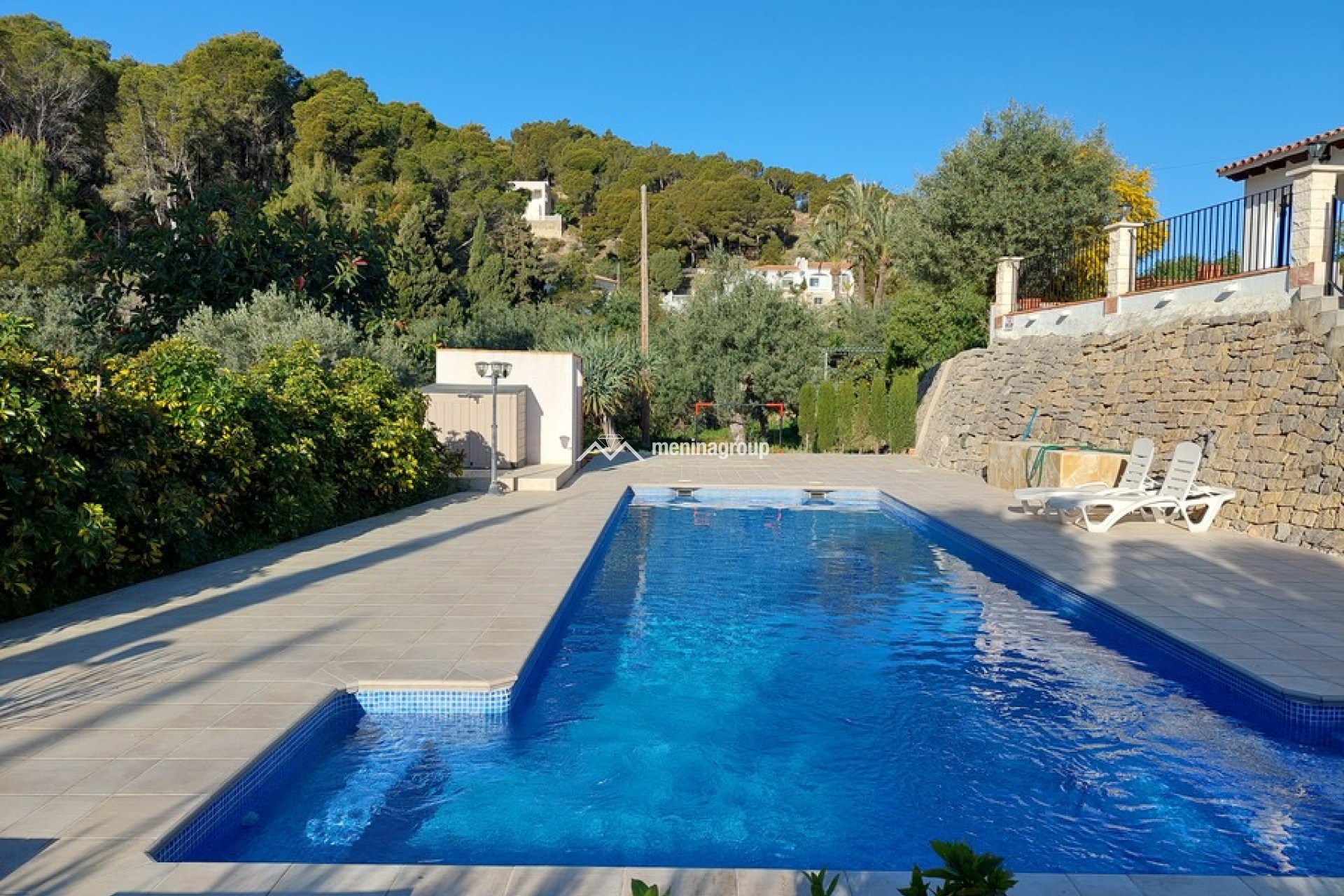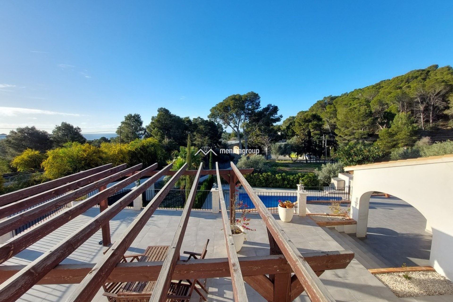 La terraza es grande con un porche y una parte descubierta y la zona de la piscina es muy bonita y con mucho espacio para disfrutar del sol.