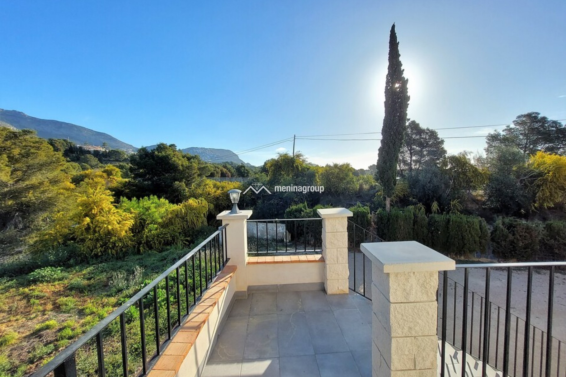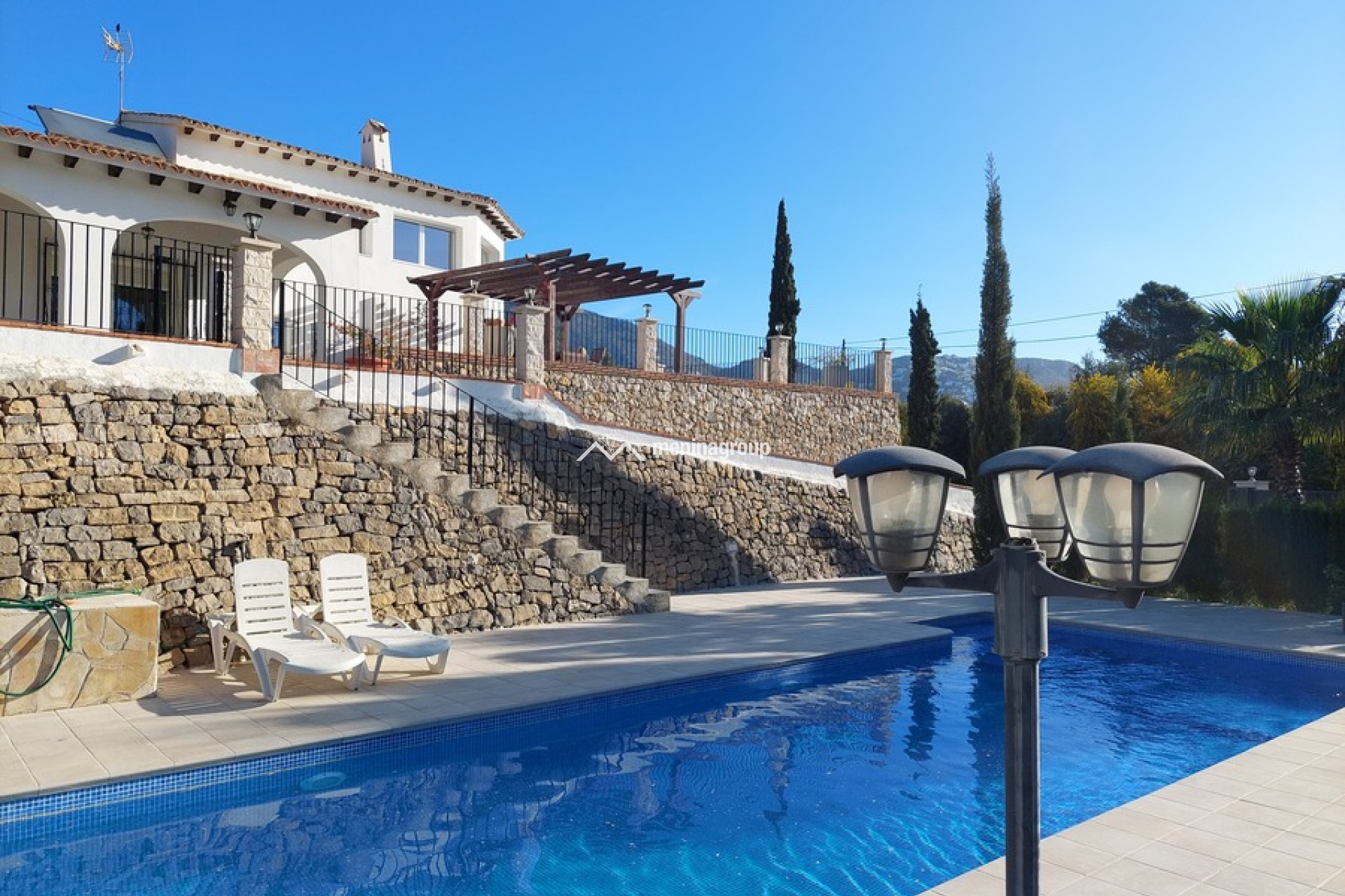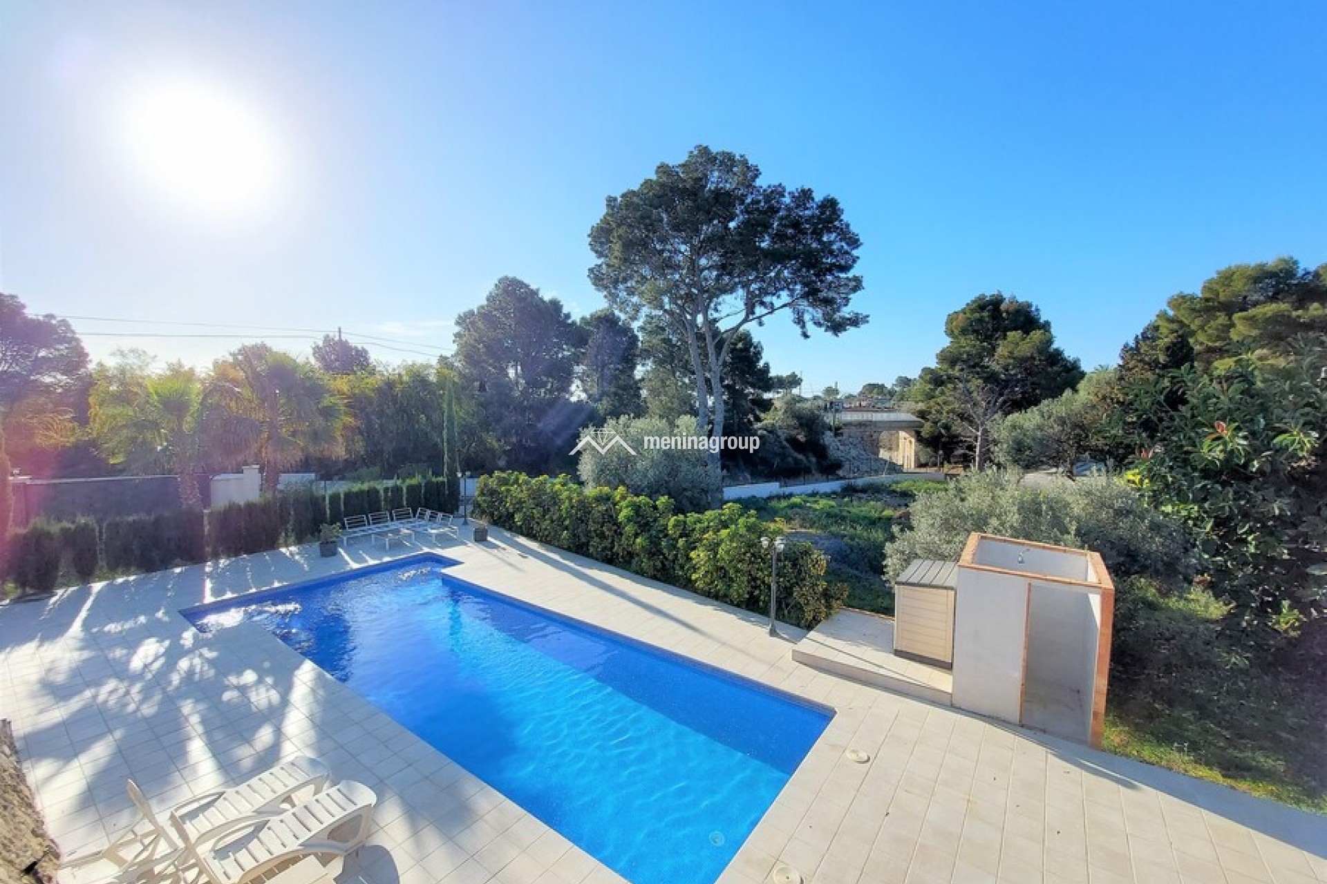 La terraza es grande con un porche y una parte descubierta y la zona de la piscina es muy bonita y con mucho espacio para disfrutar del sol.
