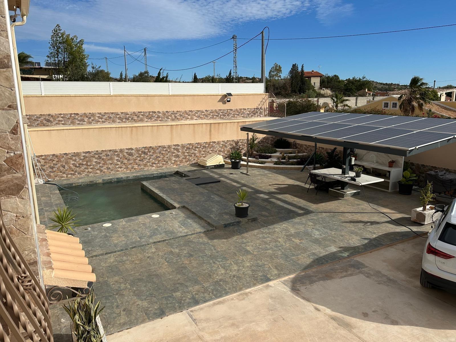 Chalet con 2 plantas, planta principal con 4 habitaciones y dos baños, salón-comedor y cocina abierta con mesa para un mínimo de 12 personas.~Habitación principal en suite con baño y vestidor. Buhardilla muy cuca a la que se accede desde una de las habitaciones con escalera plegable.~Porche con vistas que llegan hasta el mar cuando está despejado.~Planta de abajo con 2 habitaciones y un baño que es ideal como casa de invitados con vistas a la piscina.~Placas solares instaladas en 2023, carga de coche eléctrico y con potencia de sobra para dar suministro también a la casa y posibilidad de poner batería virtual.~Piscina construida en 2022, con depuradora automatica y barrendera, solarium y zona de barbacoa y zona de comer al exterior.~Garaje muy amplio para tantos coches como fuera necesario o guardar materiales, así como trastero dentro del mismo donde se encuentra el termo eléctrico que da servicio a toda la casa.~Materiales de primera calidad ~Ventanas herméticas de PVC y aislamiento mediante cámara para el frío y el calor. Estufa de pelets.