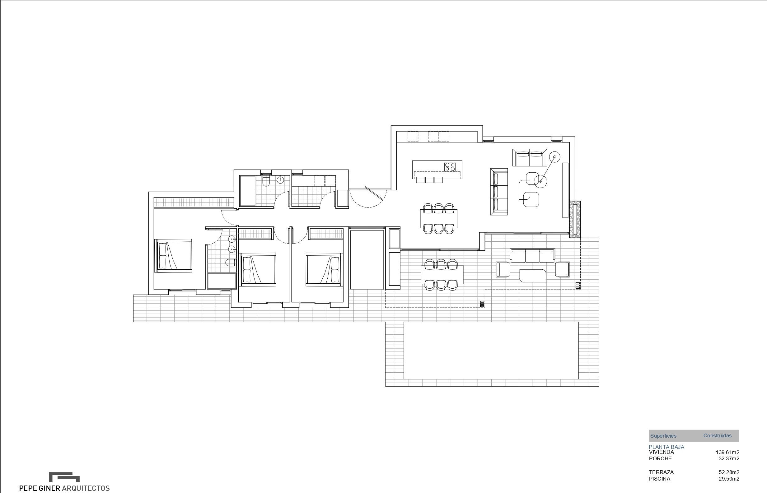 Esta casa de una sola planta ha sido diseñada para una vida cómoda y fácil y un flujo perfecto entre el interior y el exterior. Con una superficie total construida de 139,61m2, cuenta con un amplio salón comedor con cocina americana, tres dormitorios dobles y dos baños (uno de ellos en suite en el dormitorio principal). Los grandes ventanales y el acceso directo a la terraza crean un ambiente luminoso en toda la casa.
